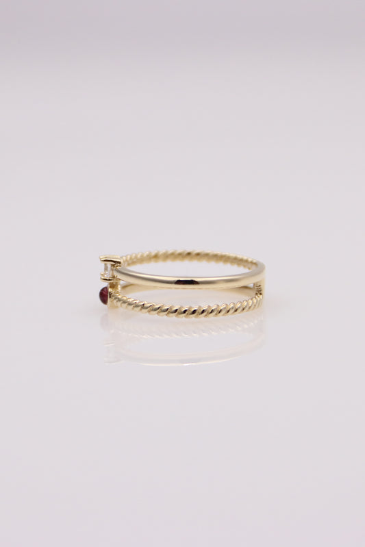 Double Band Ring with Round Clear and Red Stones