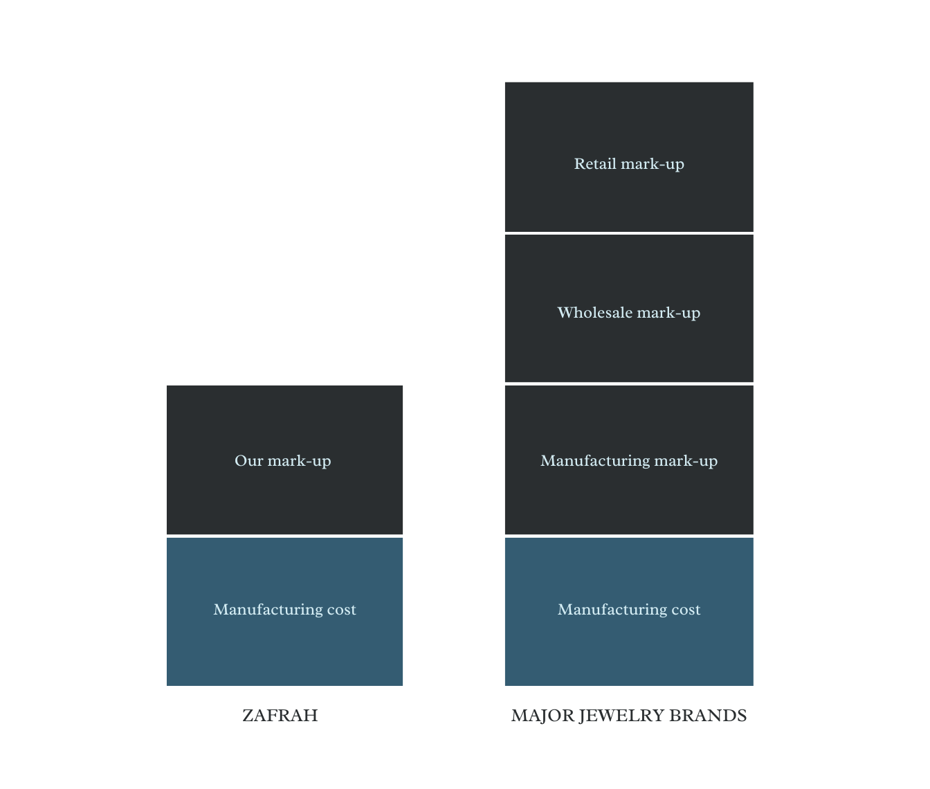 Major brands in jewel industry charge 20-x the actual cost. We think it is just absurd. We craft our own jewelry and sell it directly to you avoiding significant retailing cost. We also have a direct contact with designers that sell their products to us without the wholesalers. That way we can offer you the same high quality product that you would pay insane amount of money at brand stores. What you pay for is the material cost, labor and our small mark-up.